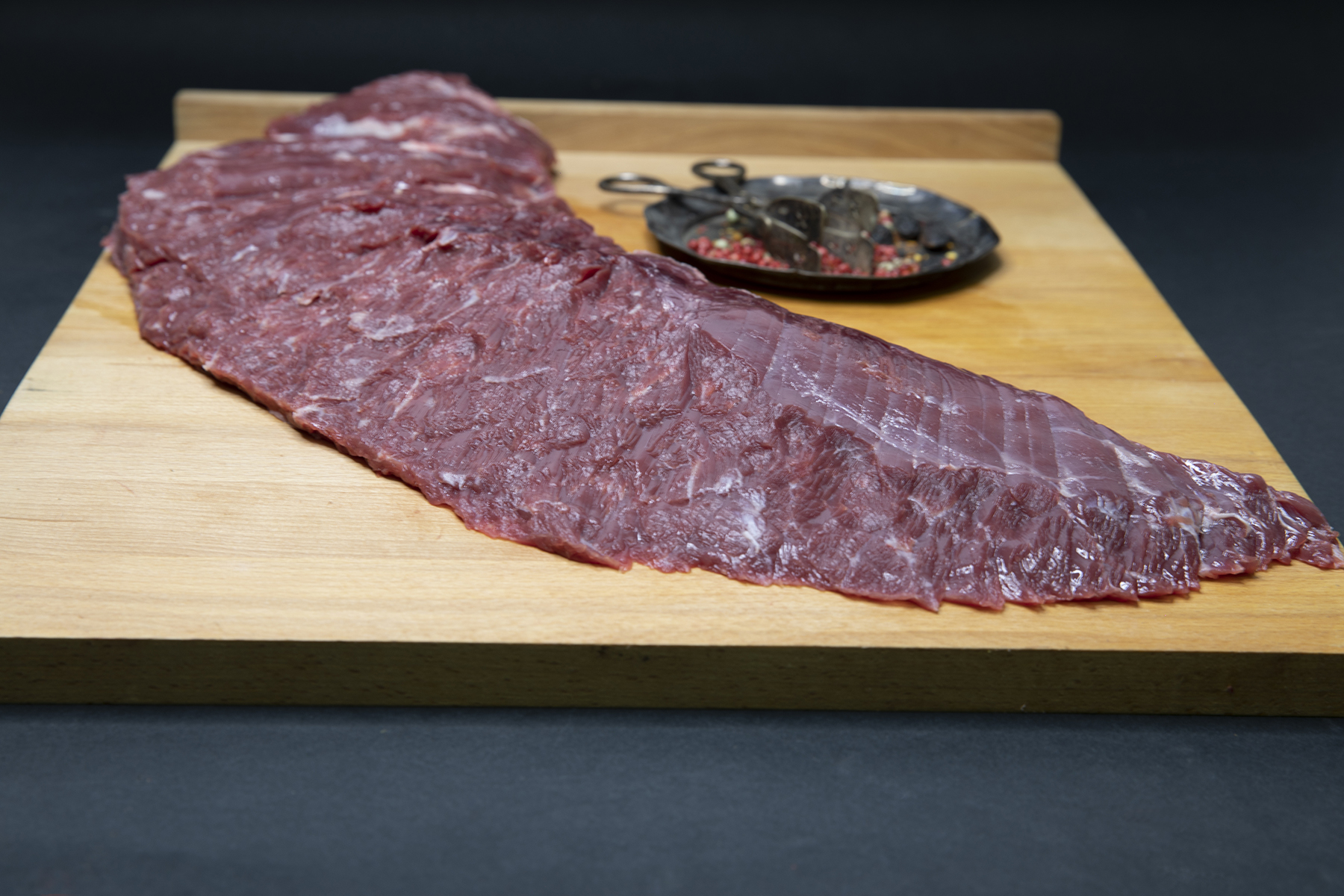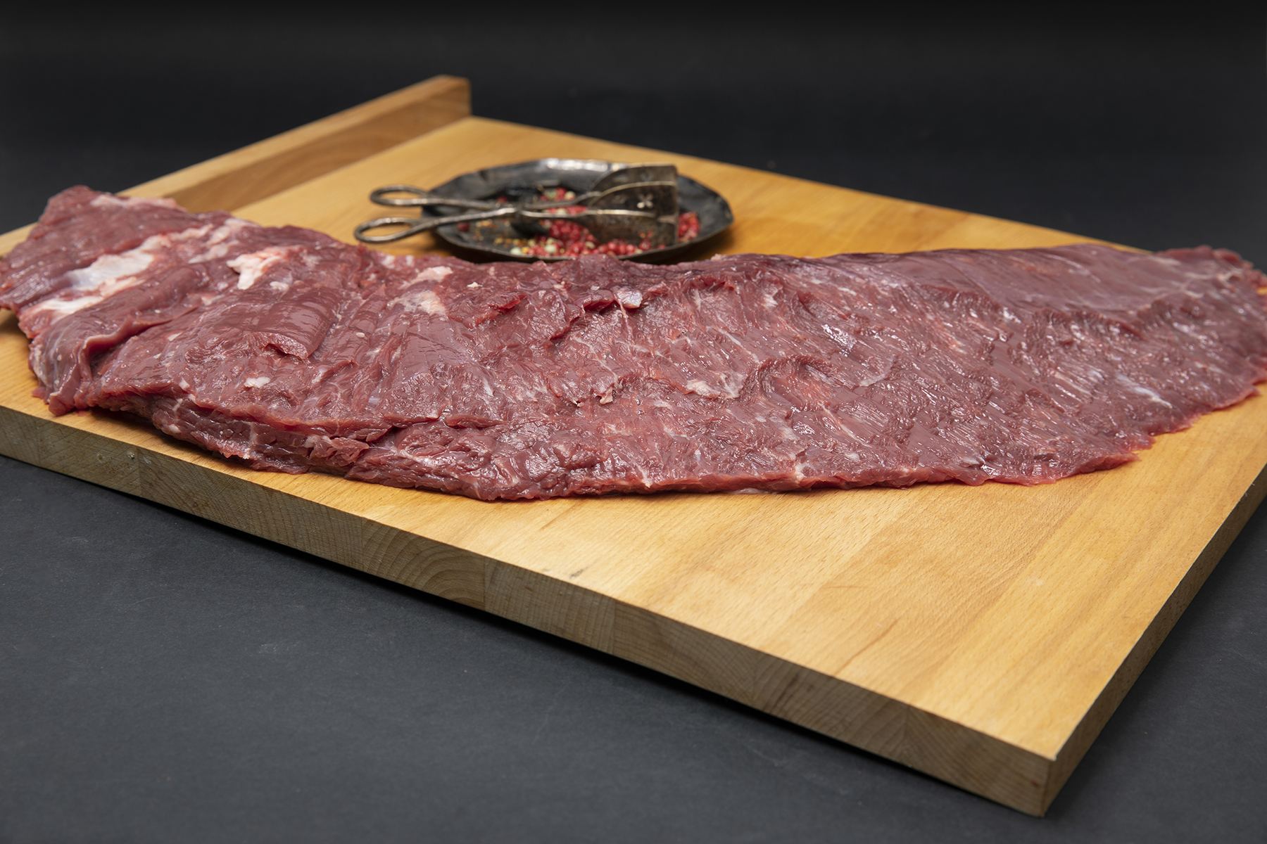 Se mai numește și flank steak și provine din partea de flanc a animalului. Subțire, cu multe inserții de grăsime, foarte aromată și cu un grad ridicat de frăgezime, prezintă un aspect franjurat și conține puțină grăsime extramusculară, fără țesuturi conexe, având un gust pronunțat, bogat și aromat. Înainte de a se pune pe grătar, se poate marina.